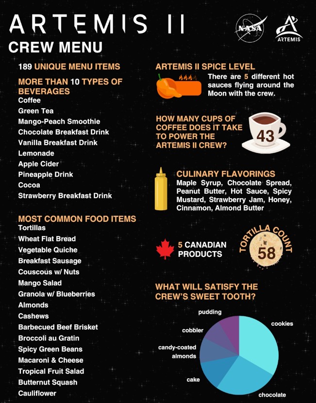 Urvalet är enormt. Totalt väntar 189 olika mat- och dryckesalternativ under de tio dagarna av Artemis II-uppdraget. Dryckesutbudet är brett: kaffe, grönt te, mangosmoothie, chokladmilkshake, lemonad, ananasjuice och ananas-kokos, för att nämna några.